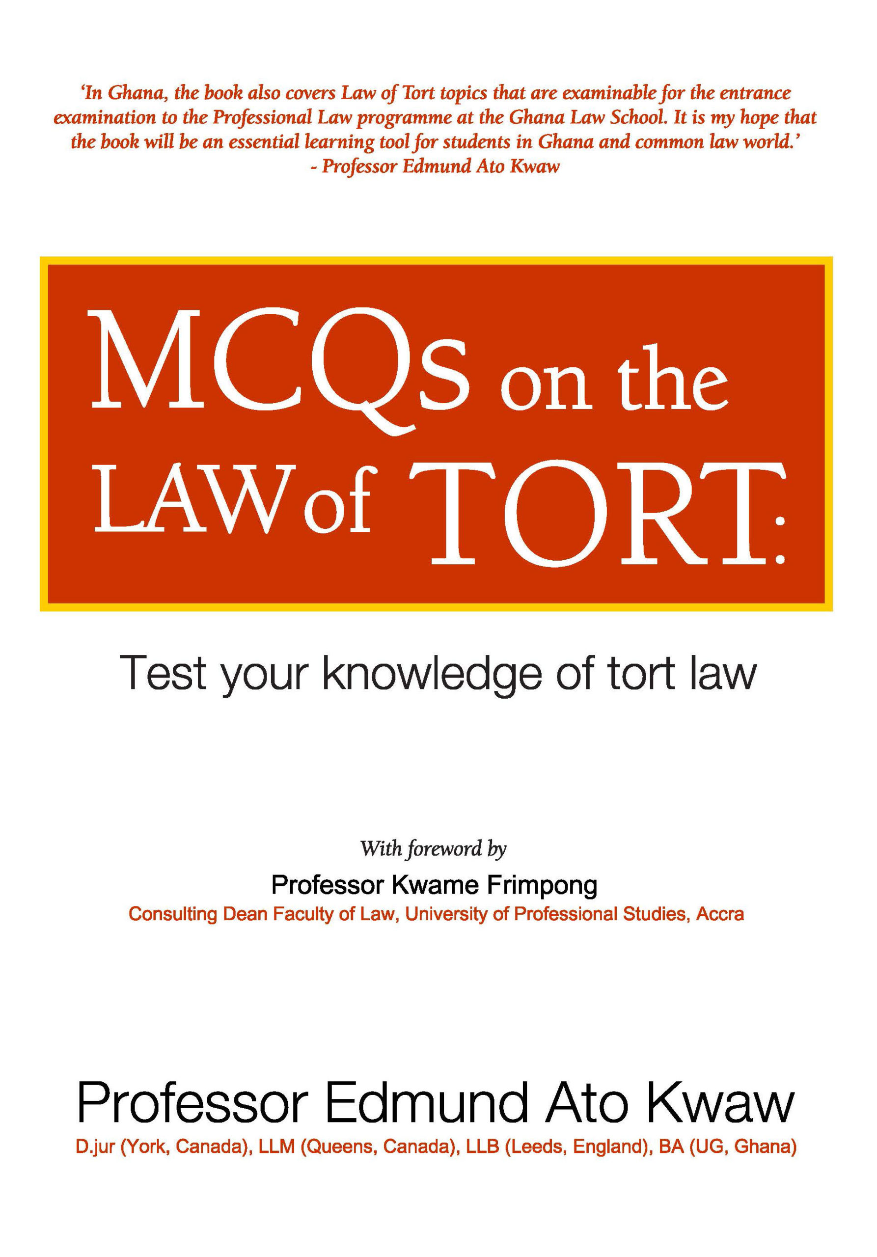 As Professor Kwame Frimpong notes in his foreword, questions in this book are practical, based on decided cases, as well as hypothetical issues and situations. The book is relevant for all common law faculties of law offering Bachelor of Laws (LL.B) programmes, and other institutions offering the Law of Torts to their students. The book is intended to be a supplement to the standard existing textbooks used by lecturers, and is intended to be a tutorial aid, to be used by lecturers in tutorials, and students in testing their knowledge on the topics covered during lectures. In Ghana, the book also covers Law of Tort topics that are examinable for the entrance examination to the Professional Law programme at the Ghana Law School. It is my hope that the book will be an essential learning tool for students in Ghana and common law world.